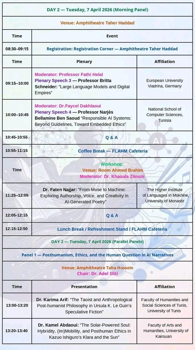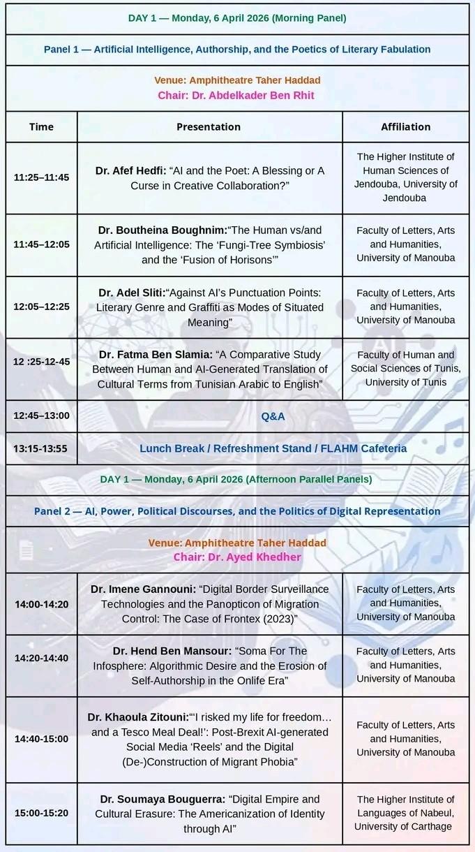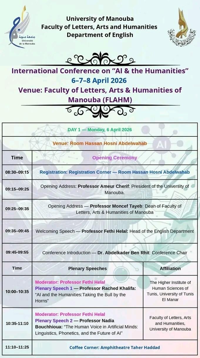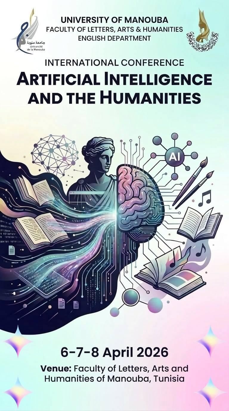 ينظّم قسم الإنجليزية بكلية الآداب والفنون والإنسانيات بمنوبة، بالتعاون مع مخبر المباحث الدلالية واللسانيات الحاسوبية ومخبر ريادي، المؤتمر الدولي الموسوم ب «الذكاء الاصطناعي والإنسانيات» وذلك أيام 6 و7 و8 أفريل 2026. ويأتي هذا الحدث العلمي ليؤسّس فضاءً أكاديميًا خصبًا للحوار بين مختلف الاختصاصات، حيث يلتقي الباحثون لاستكشاف رهانات الذكاء الاصطناعي وانعكاساته على مجالات الإنسانيات، ولا سيما في ما يتعلّق بالدراسات اللغوية، وتحليل الخطاب، وإعادة تشكيل المعرفة في العصر الرقمي، بما يفتح آفاقًا جديدة للبحث العلمي المشترك ويعزّز من حضور المقاربات اللسانية الحاسوبية في السياق الأكاديمي المعاصر