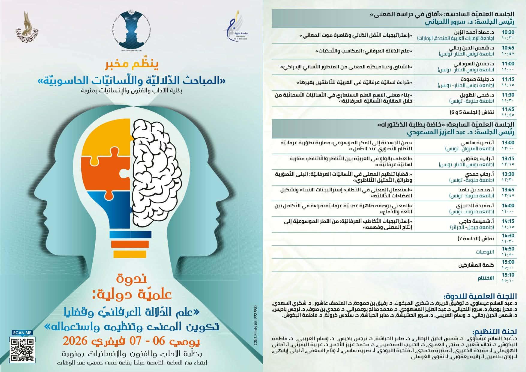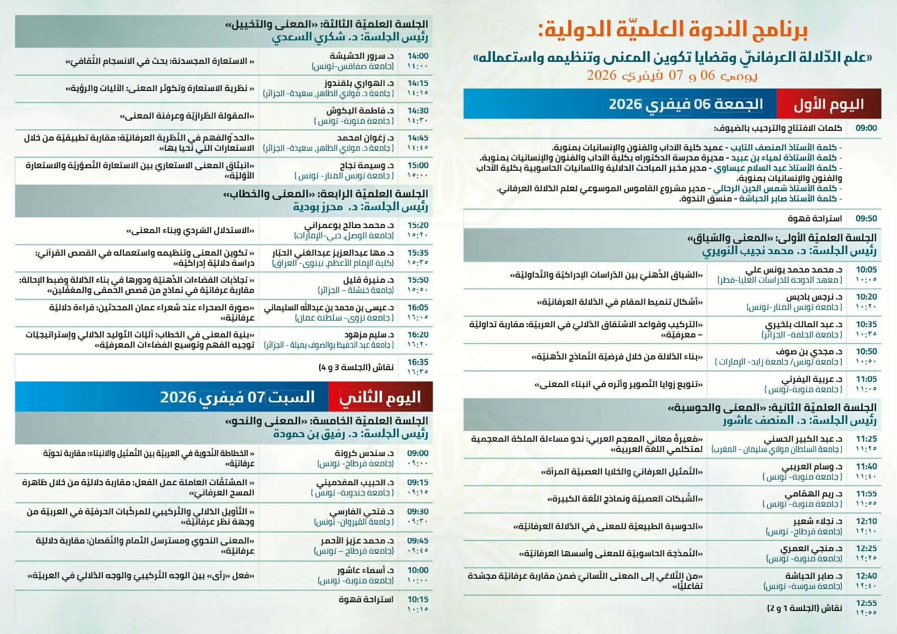 برنامج الندوة العلميّة الدوليّة علم الدّلالة العرفانيّ وقضايا تكوين المعنى وتنظيمه واستعماله يومي 6 و7 فيفري 2026 بكلية الآداب والفنون والإنسانيّات بمنوبة- جامعة منوبة - تونس.pdf