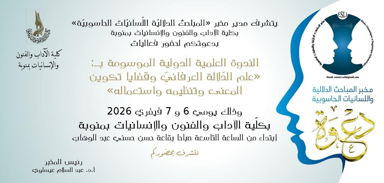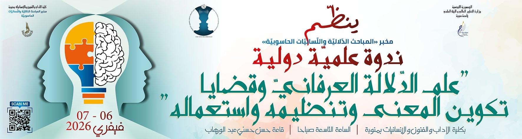 ينظّم مخبر "المباحث الدلاليّة واللسانيّات الحاسوبيّة" الندوة العلميّة الدوليّة الأولى لفريق مشروع القاموس الموسوعيّ لعلم الدّلالة العرفانيّ تحت عنوان"علم الدّلالة العرفانيّ وقضايا تكوين المعنى وتنظيمه واستعماله" يومي 6 و7 فيفري 2026 بكلية الآداب والفنون والإنسانيّات بمنوبة، جامعة منوبة - تونس.