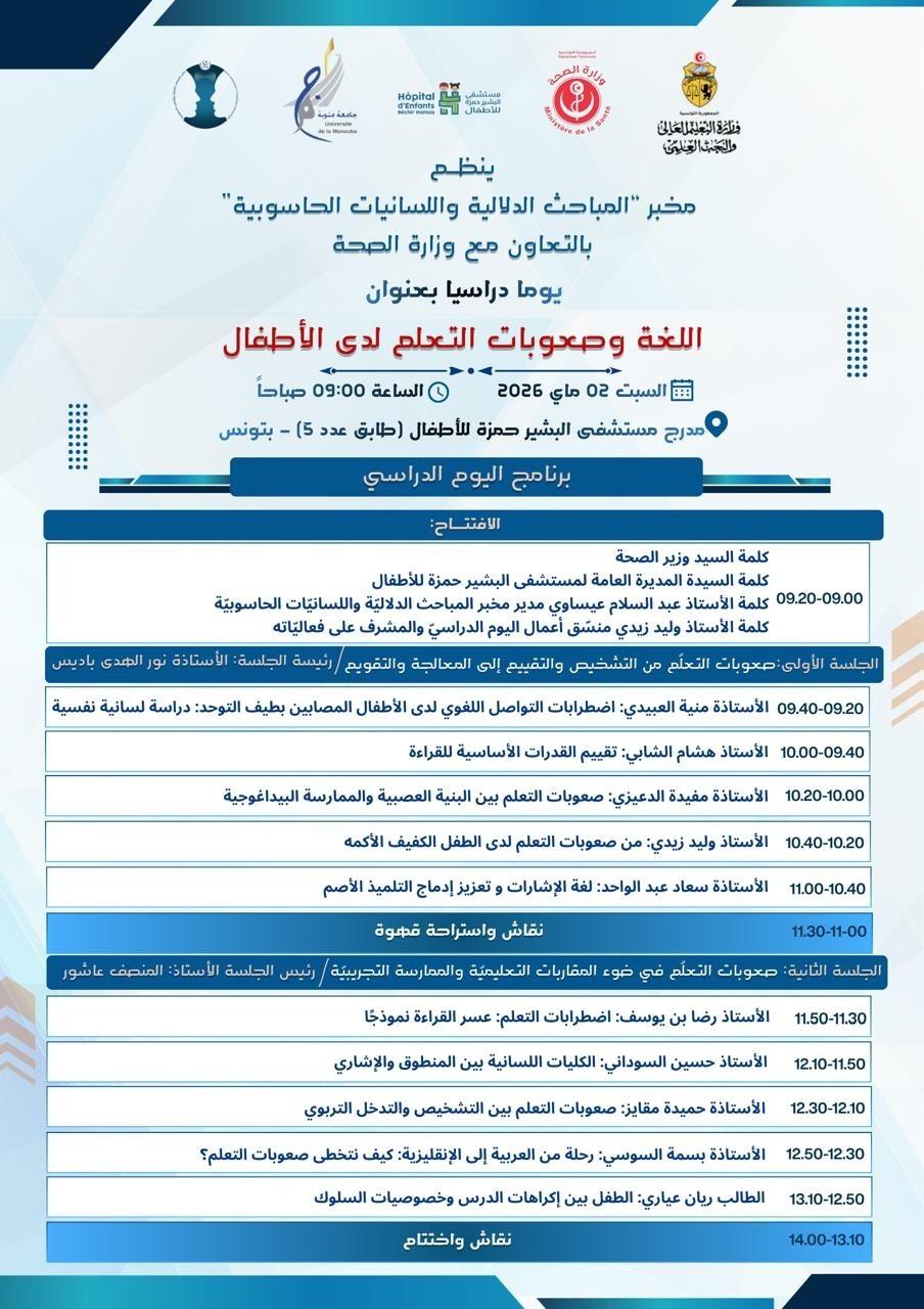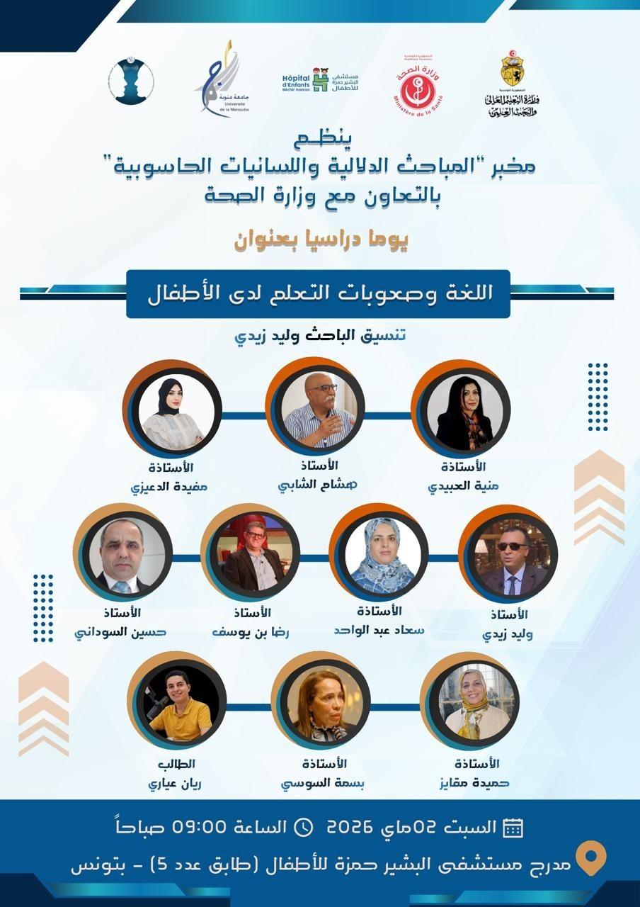 في تجلٍّ واضح لانفتاحه على محيطه العلمي والمؤسساتي، يواصل مخبر “المباحث الدلالية واللسانيات الحاسوبية” ترسيخ ثقافة التعاون والتكامل المعرفي من خلال تنظيم هذا اليوم الدراسي بالشراكة مع وزارة الصحة، تحت عنوان: “اللغة وصعوبات التعلّم لدى الأطفال”. وهو انفتاح لا يكتفي بالإطار الشكلي، بل يعكس وعيًا عميقًا بضرورة تضافر الجهود بين الاختصاصات لفهم الظواهر المعقّدة التي تمسّ الطفل في مساره التعليمي والنمائي.