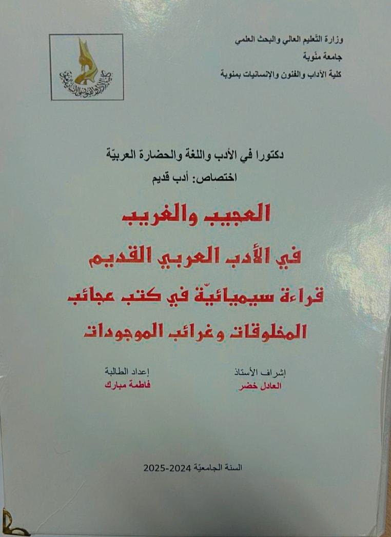 " مناقشة أطروحة الدكتورا الموسومة ب: " العجيب والغريب في الأدب العربي القديم: قراءة سيميائية في كتاب عجائب المخلوقات وغرائب الموجودات