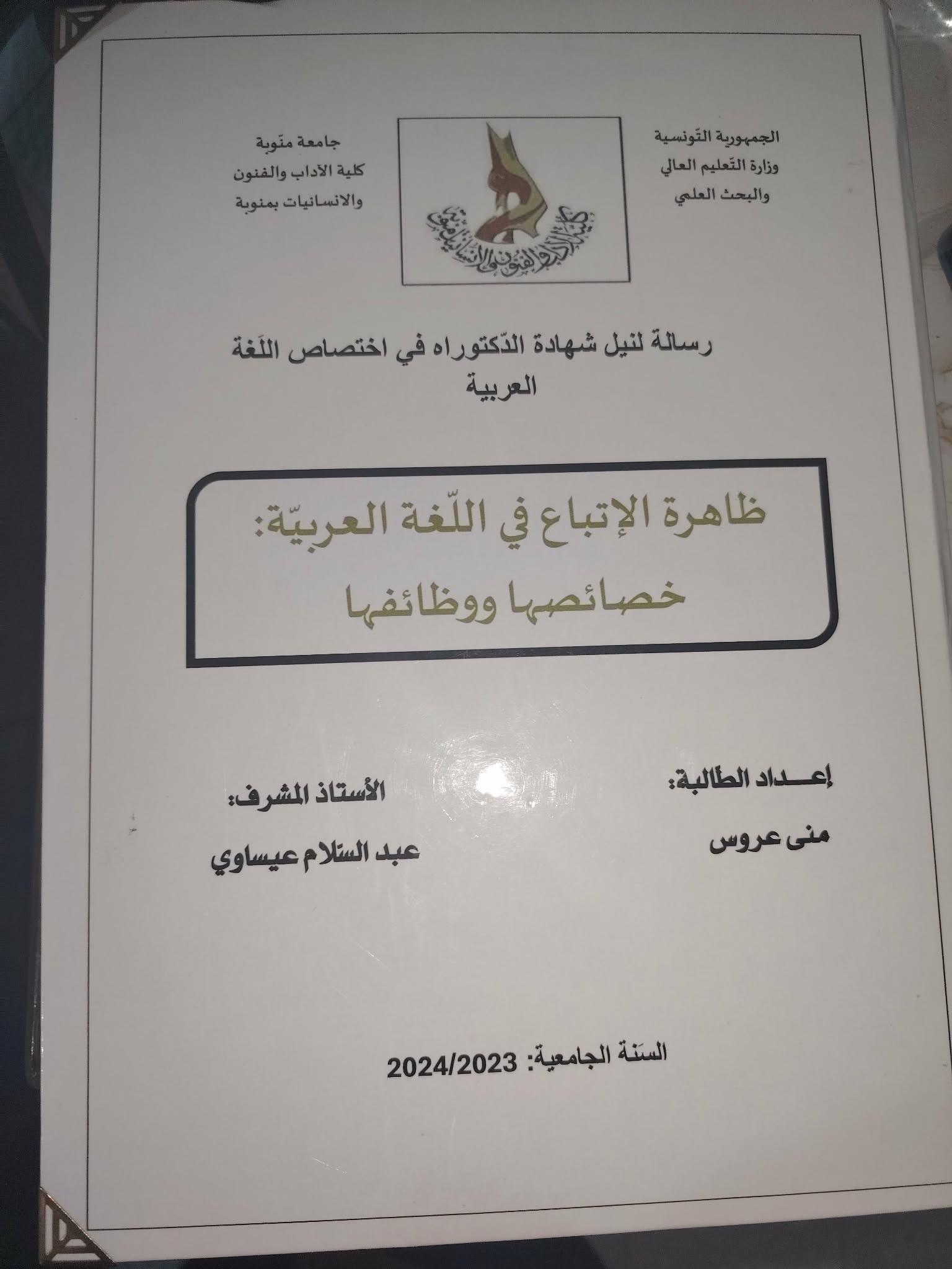 تهانينا للطالبة منى عروس العضو بالمخبر مناقشها اليوم الجمعة 12 ديسمبر 2025 أطروحة الدكتورا في اللغة والآداب و الحضارة العربية، اختصاص لسانيات الموسومة ب: " ظاهرة الإتباع في اللغة العربيّة: خصائصها ووظائفها"
