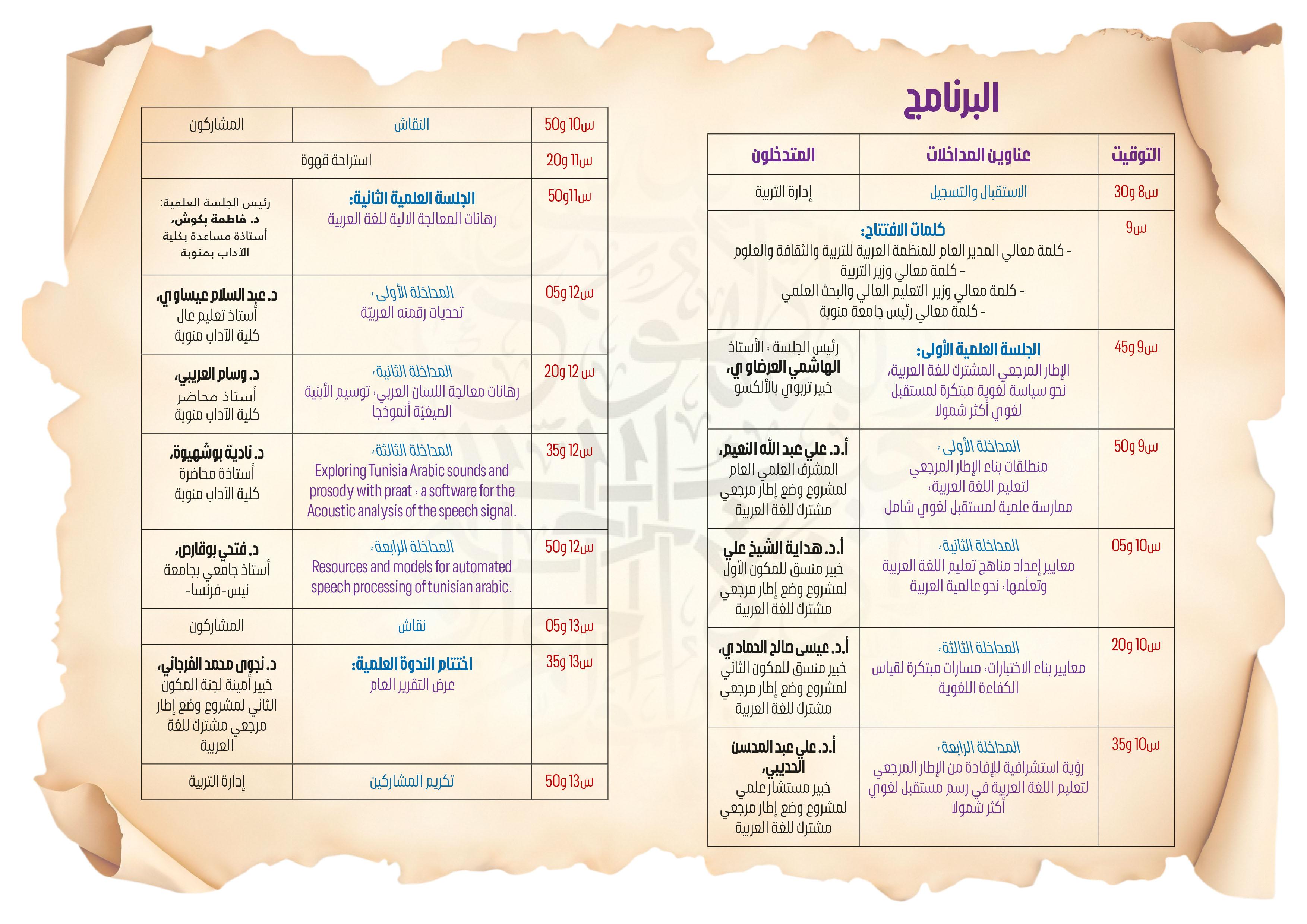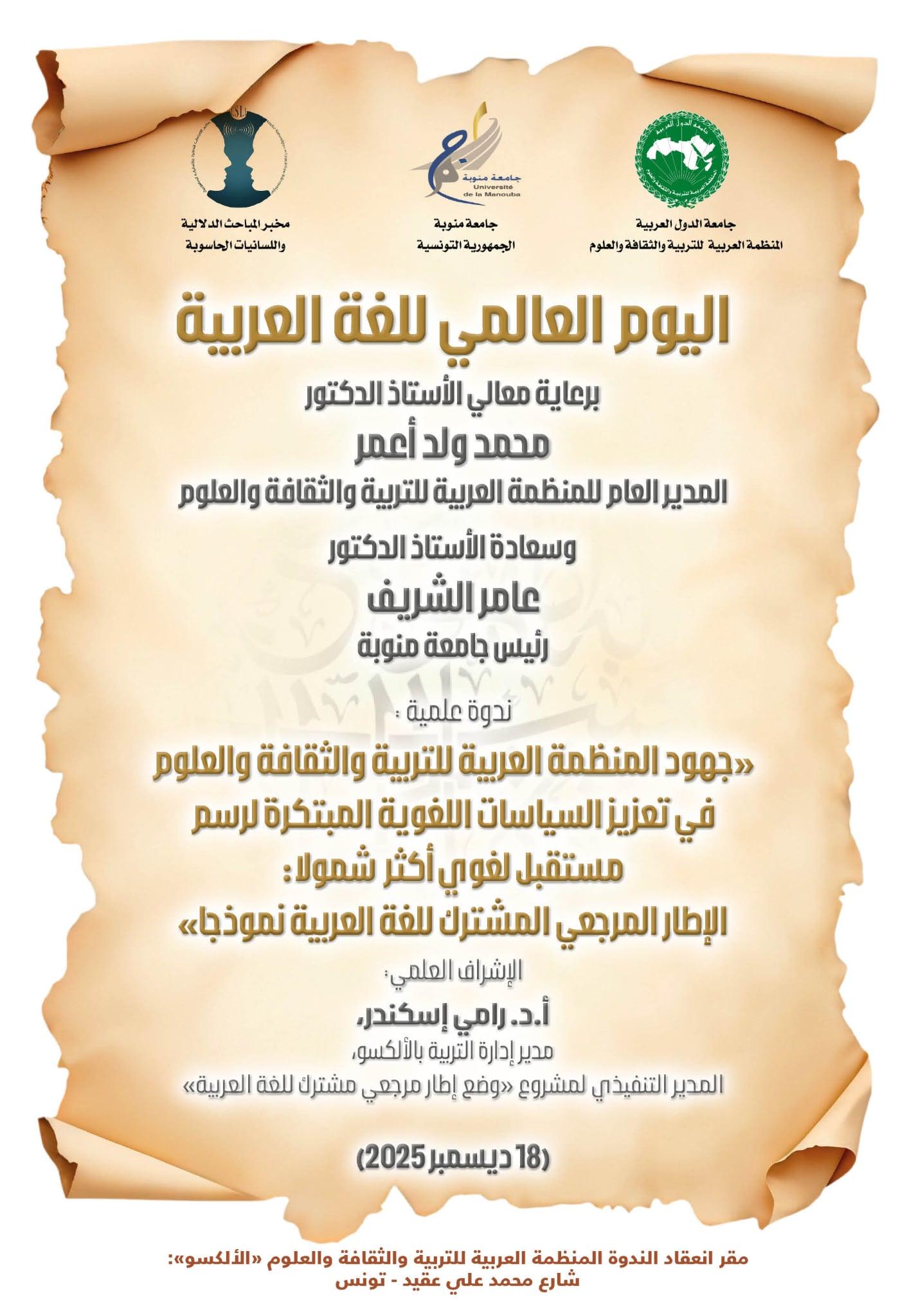 في إطار الاحتفاء باليوم العالمي للغة العربية تنظم المنظمة العربية للتربية والثقافة والعلوم (الألكسو)، بالتعاون مع جامعة منوبة ومخبر المباحث الدلاليّة واللسانيّات الحاسوبية ندوة علمية بعنوان: "جهود المنظمة العربية للتربية والثقافة والعلوم في تعزيز السياسات اللغوية المبتكرة لرسم مستقبل لغوي أكثر شمولًا: الإطار المرجعي المشترك للغة العربية نموذجًا". وتهدف هذه الندوة إلى فتح أفق علمي للنقاش حول السياسات اللغوية المعاصرة، ودور المبادرات العربية المشتركة في تطوير تعليم اللغة العربية وتقويمها، مع تسليط الضوء على الإطار المرجعي المشترك للغة العربية بوصفه مشروعًا استراتيجيًا يعكس رؤية تكاملية للنهوض باللغة العربية في السياقات التعليمية والثقافية المتعددة. ويشارك في هذه الندوة ثلّة من الباحثين وأعضاء مخبر المباحث الدلالية واللسانيات الحاسوبية، إلى جانب مدير المخبر، بمداخلات علمية تسهم في تعميق النقاش وتبادل الخبرات حول آفاق السياسات اللغوية المبتكرة وتحدياتها الراهنة.