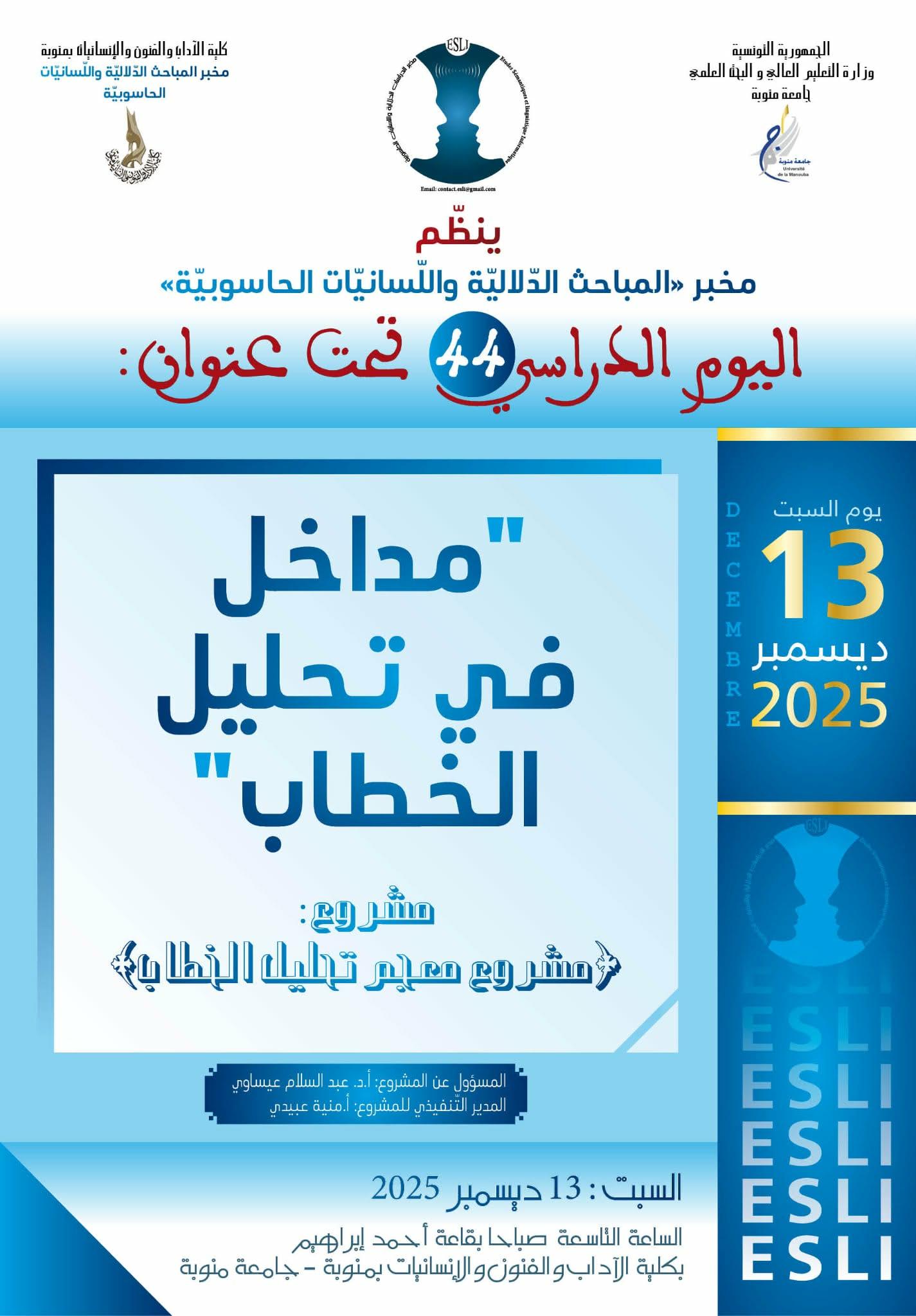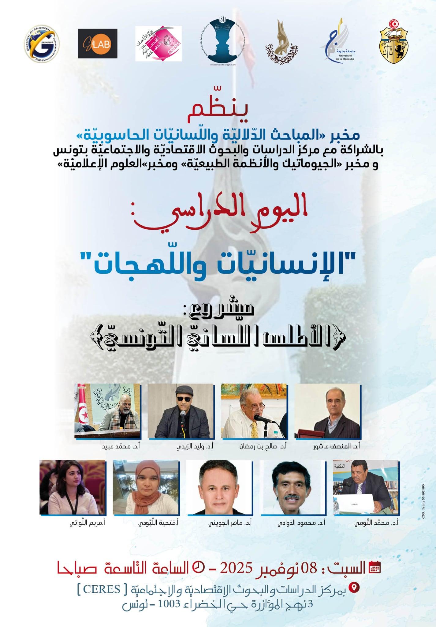 .اليوم الدراسيّ "43" تحت عنوان "إشكاليّات دراسة اللّهجة التونسيّة:التّنوع اللّهجيّ والتواصل اليوميّ" (مشروع الأطلس اللّسانيّ التّونسيّ)، السبت 29 نوفمبر 2025 بقاعة "أحمد إبراهيم" بكلية الآداب والفنون والإنسانيات بمنوبة